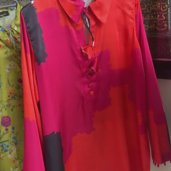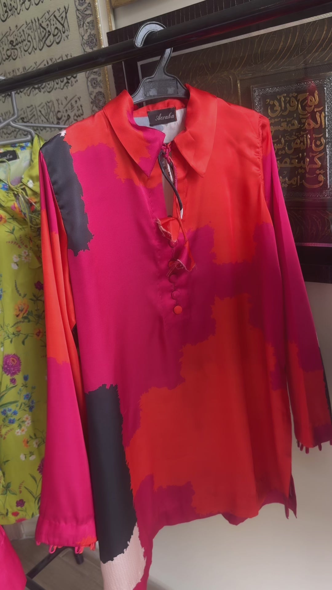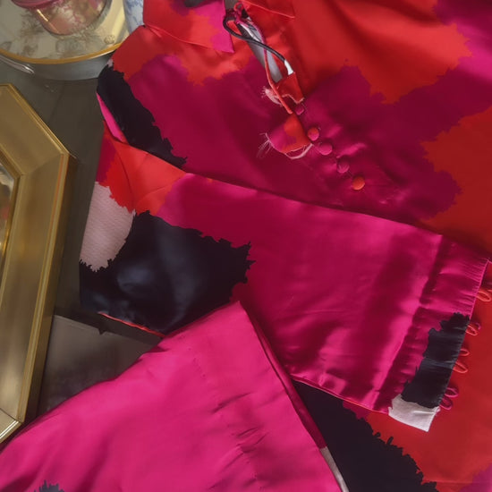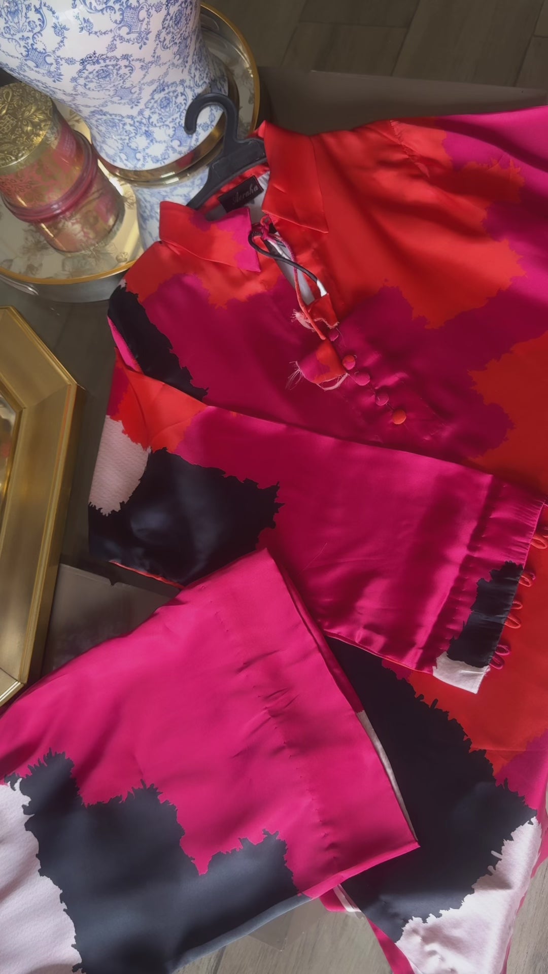 Sleek sophistication meets playful print in this effortlessly chic silk set, featuring a collared shirt paired with culotte trousers for a modern, fluid silhouette.