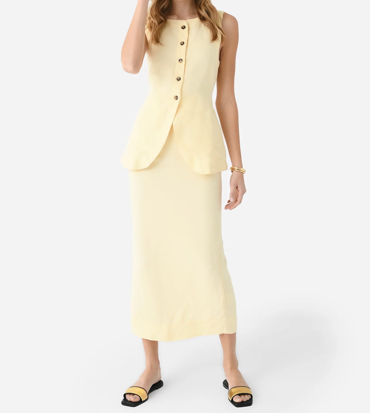 Crafted from breathable, natural linen, the structured vest features a flattering silhouette with a button-front closure, while the matching skirt offers a sleek, feminine finish.