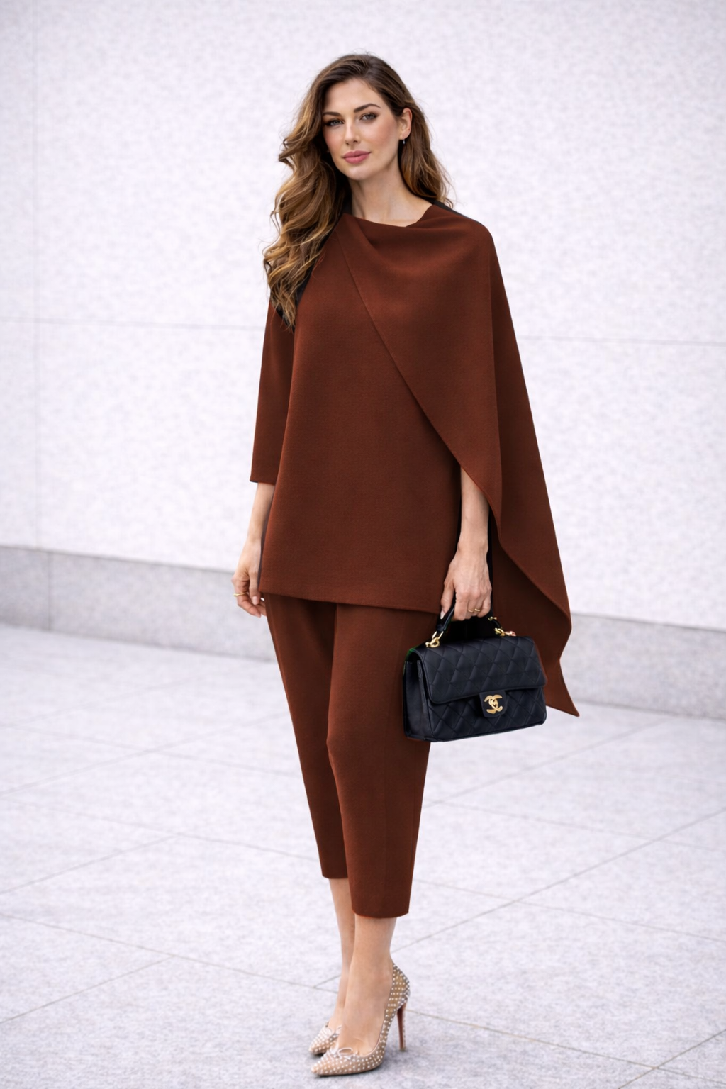 Designed with a signature draped shoulder in a cone shape, crafted from lightweight georgette. Paired with versatile culottes or a capri, this set brings effortless flow and modern elegance to your spring wardrobe.