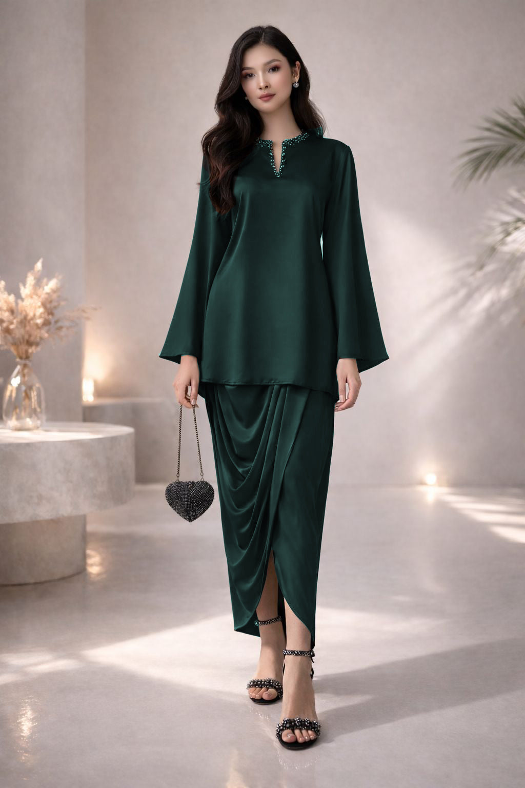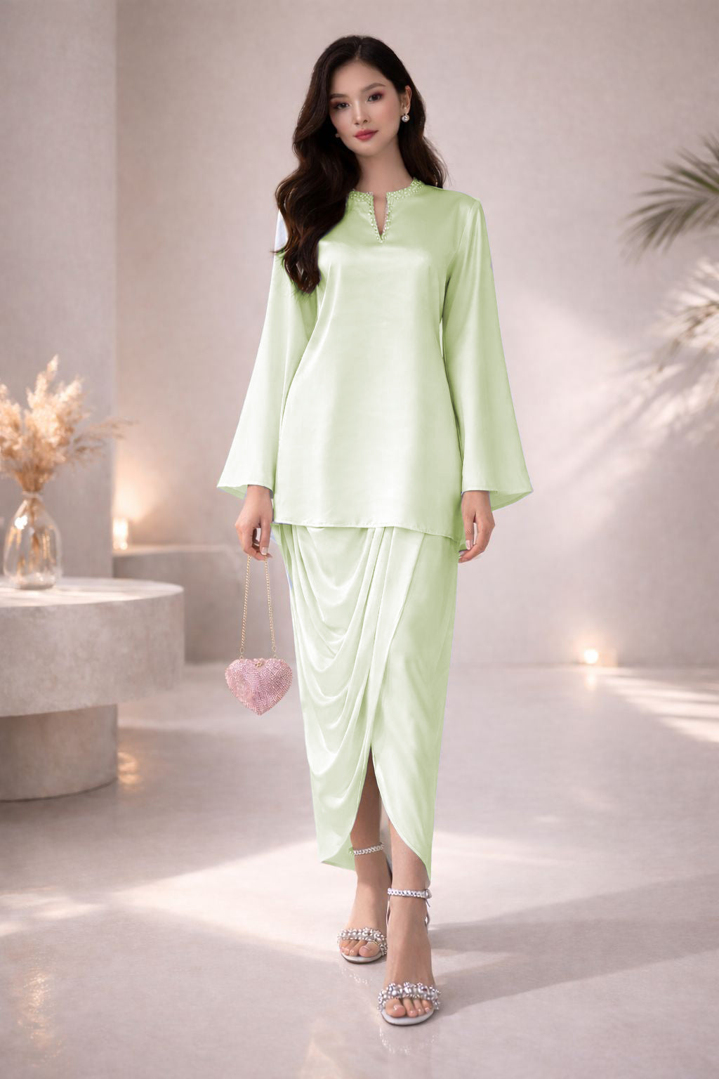 Step into effortless style with our Fuse Dhoti Set — a beautifully designed silk set featuring an embellished neckline adorned with delicate gems for that perfect touch of sparkle. The dhoti-style drape brings a modern twist to traditional wear, offering both comfort and chic appeal.