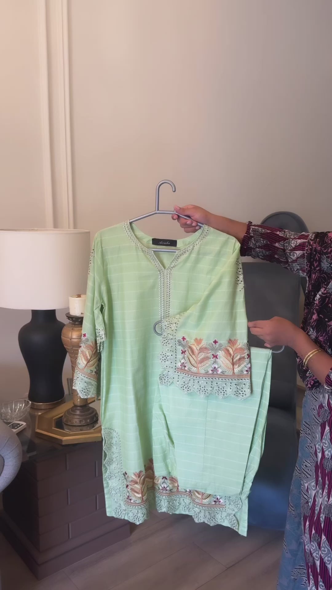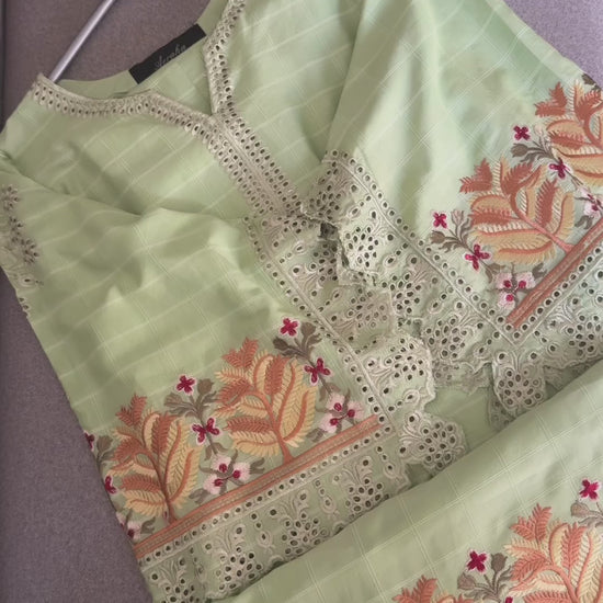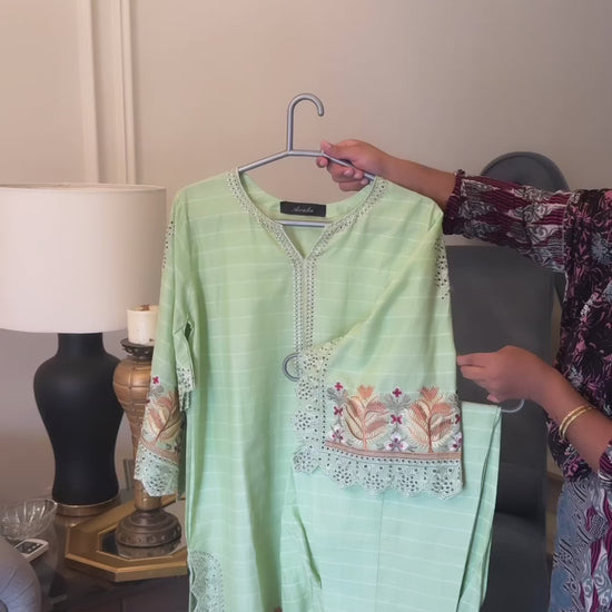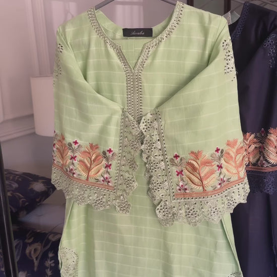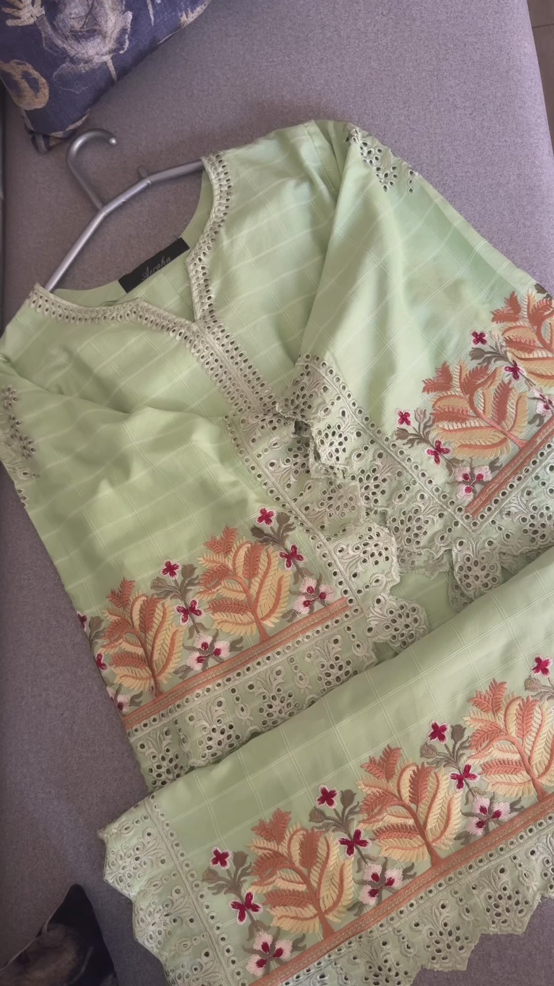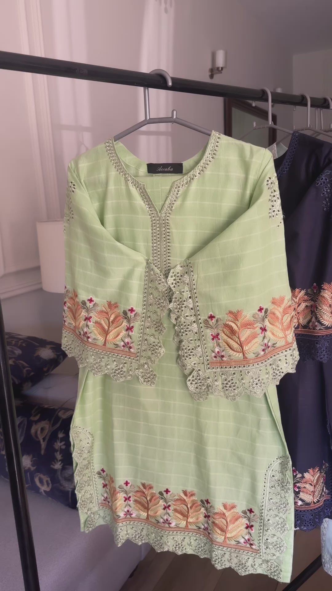 Embroidered chicken kari 2 piece set with max loose embroidered sleeves. Paird with plain chicken kari trousers.