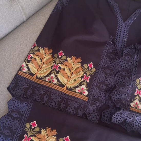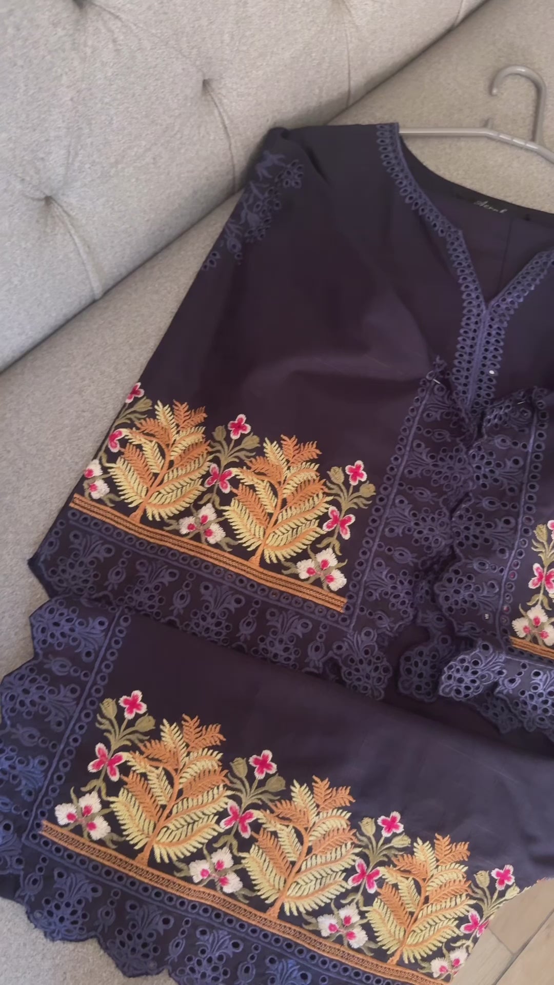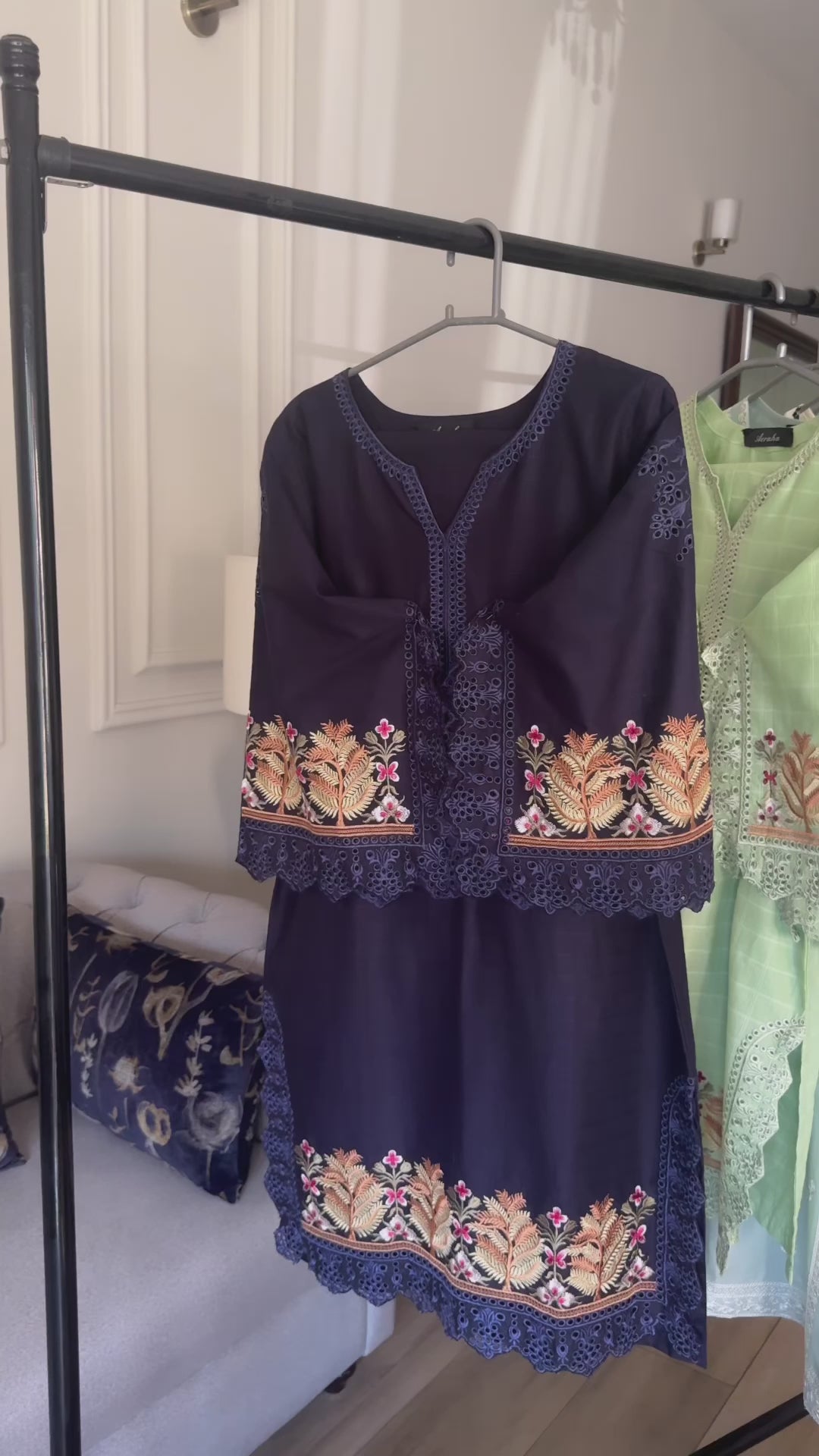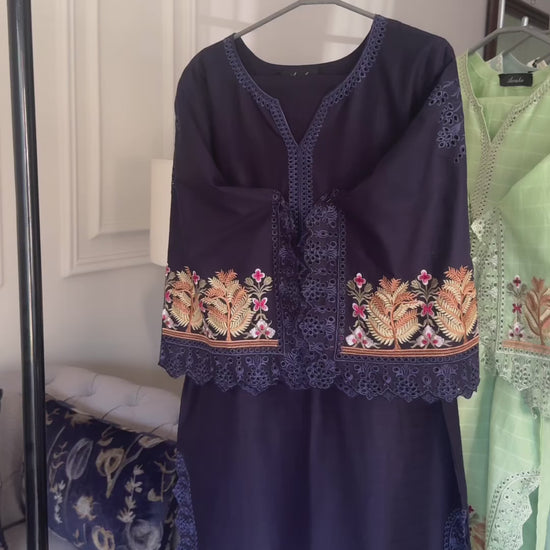 Embroidered chicken kari 2 piece set with max loose embroidered sleeves. Paird with plain chicken kari trousers.